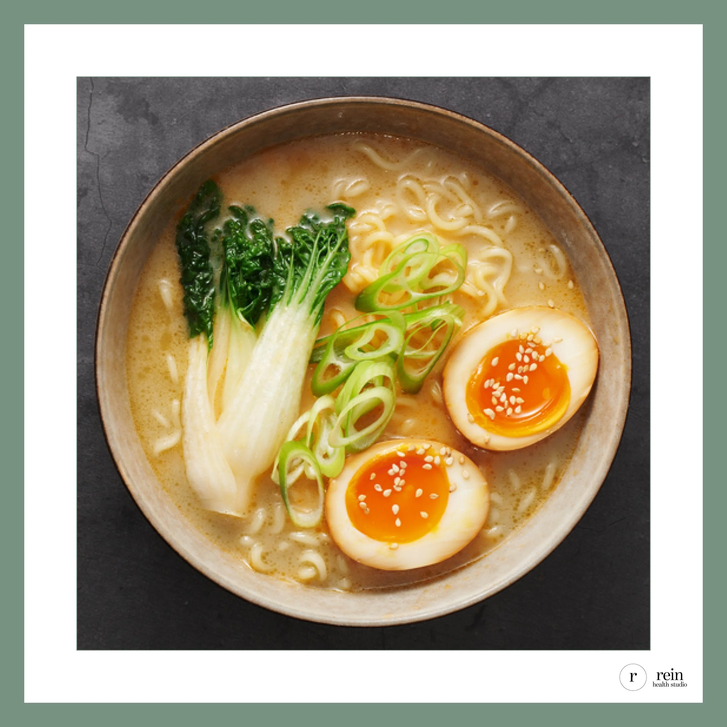 Method: Sauté garlic + ginger briefly in sesame oil. Add broth and bring to a gentle simmer. Whisk in miso paste off the heat to preserve live cultures. Cook noodles separately + assemble bowls. Top with egg, bok choy, scallion + sesame. Tastes even better the next day once the flavors have had time to settle.